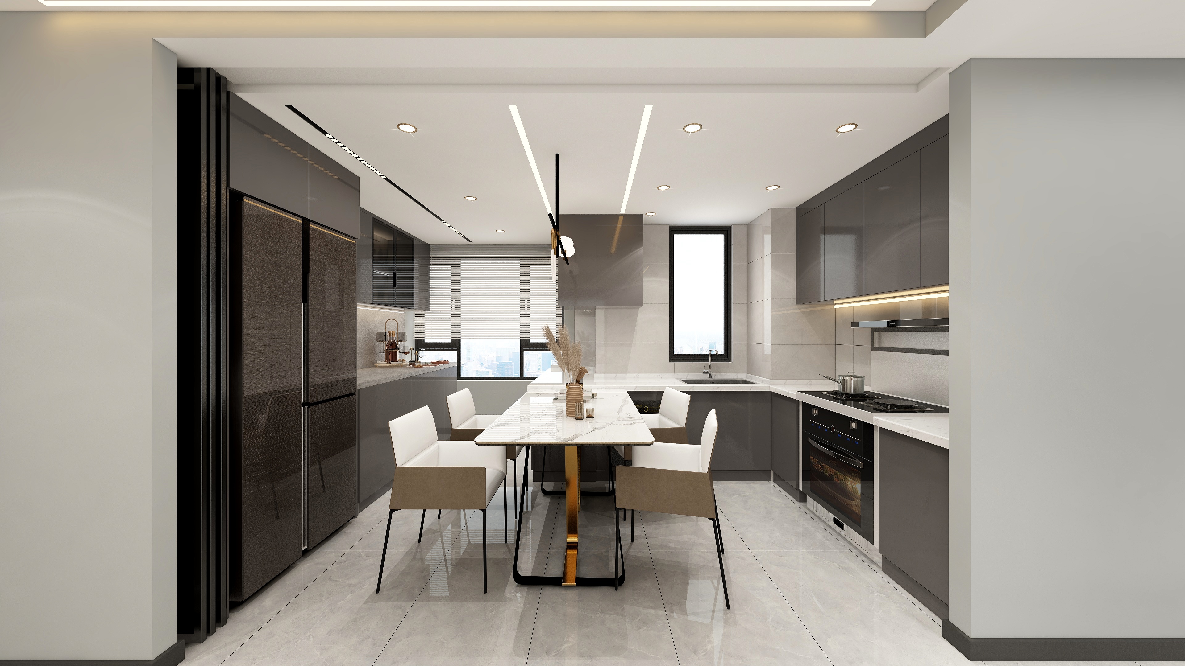 本方案設計簡潔大方,時尚前衛,電視背景采用高級灰色調組合式電視柜,美觀實用完美結合,廚房開敞式的空間,活動式的白色巖板餐桌和櫥柜臺面融合為一體,廚房操作用餐都非常方便,主臥簡單整潔的氛圍,優雅的奶咖色讓整個空間暖意融融,溫馨高級不失沉穩。