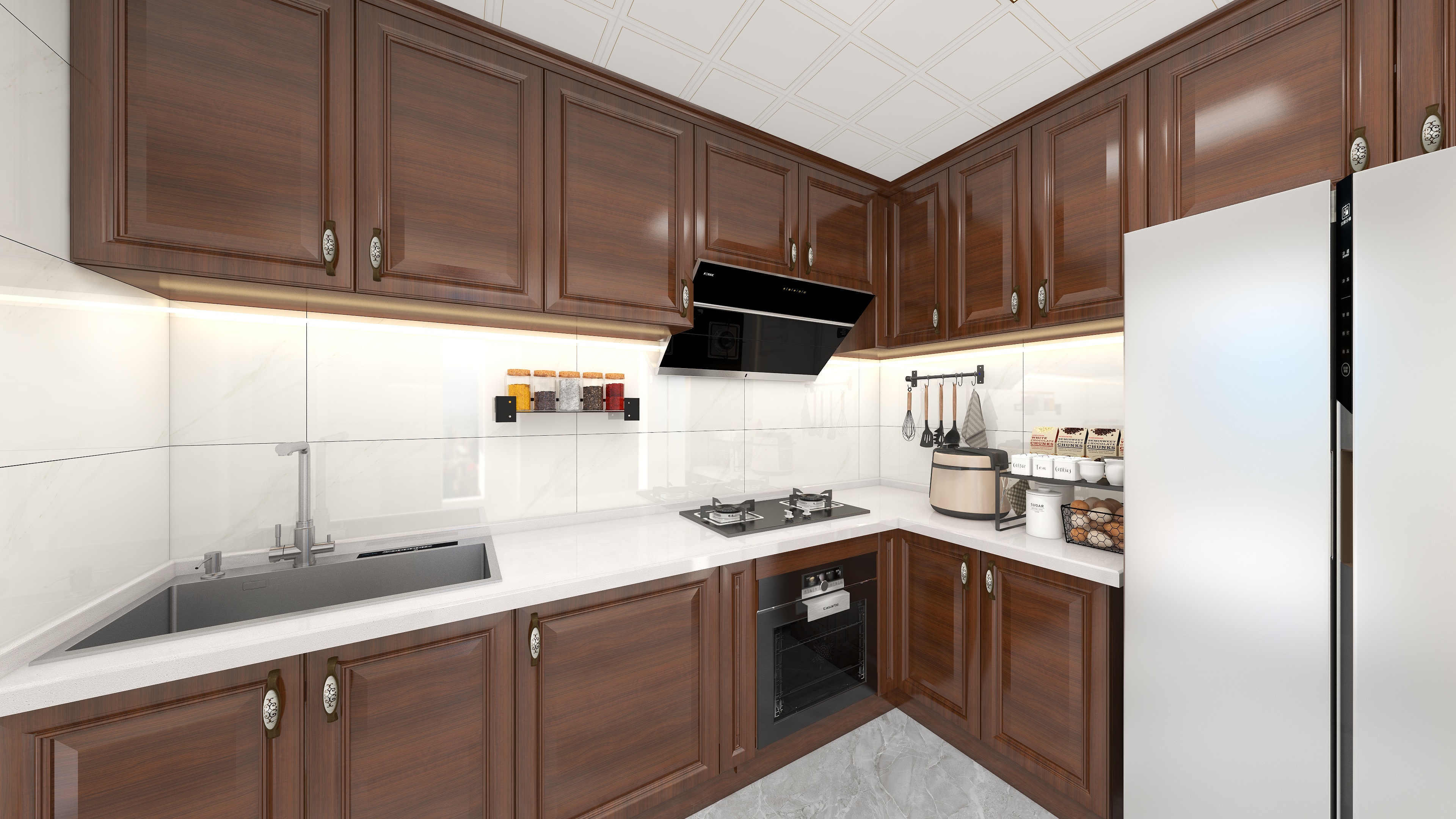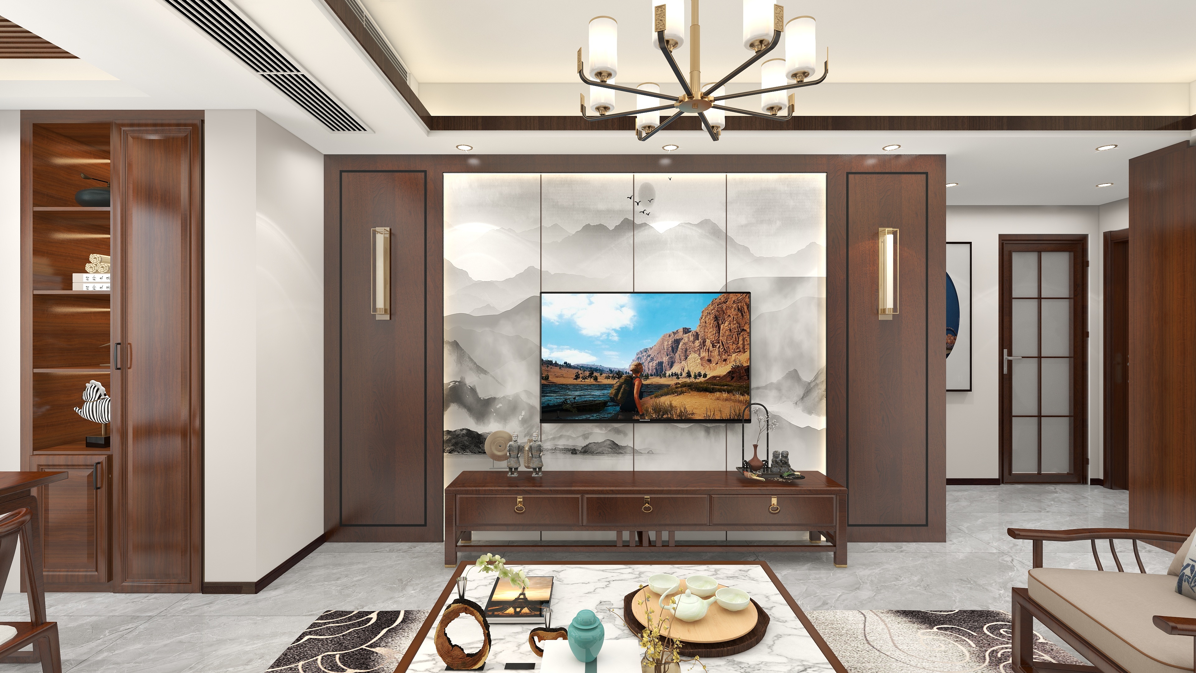 現代中式的顏色比較簡單,耐看,實木墻板的背景墻,舒適典雅,電視背景和沙發背景均采用對稱的手法,傳統內斂,紅木的家具,墻面的壁畫,到處都透露出濃郁的東方之美,大而不空,厚而不重,格調盡顯。