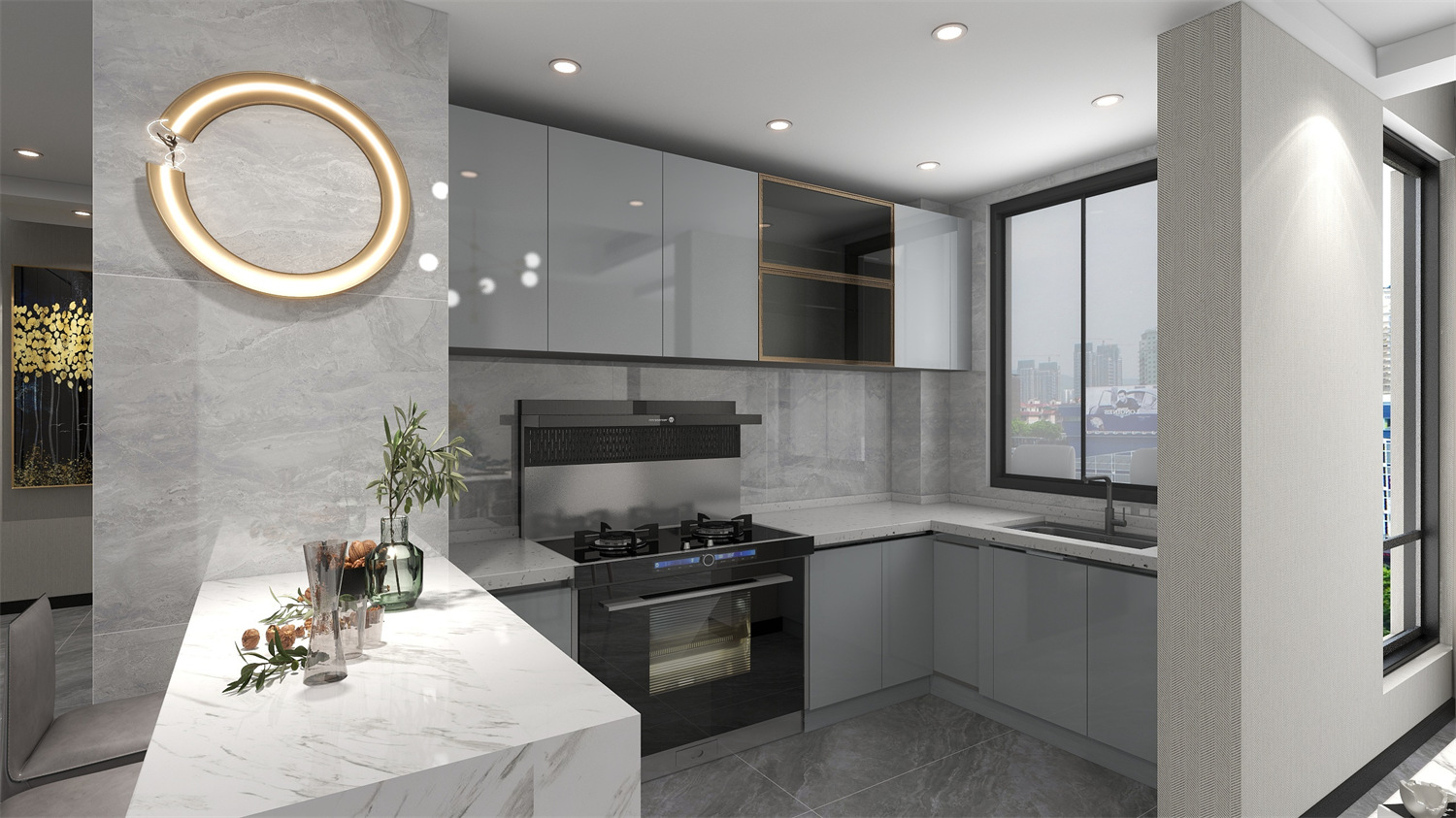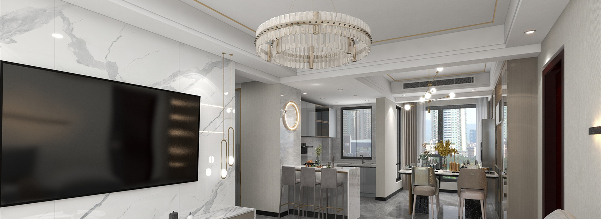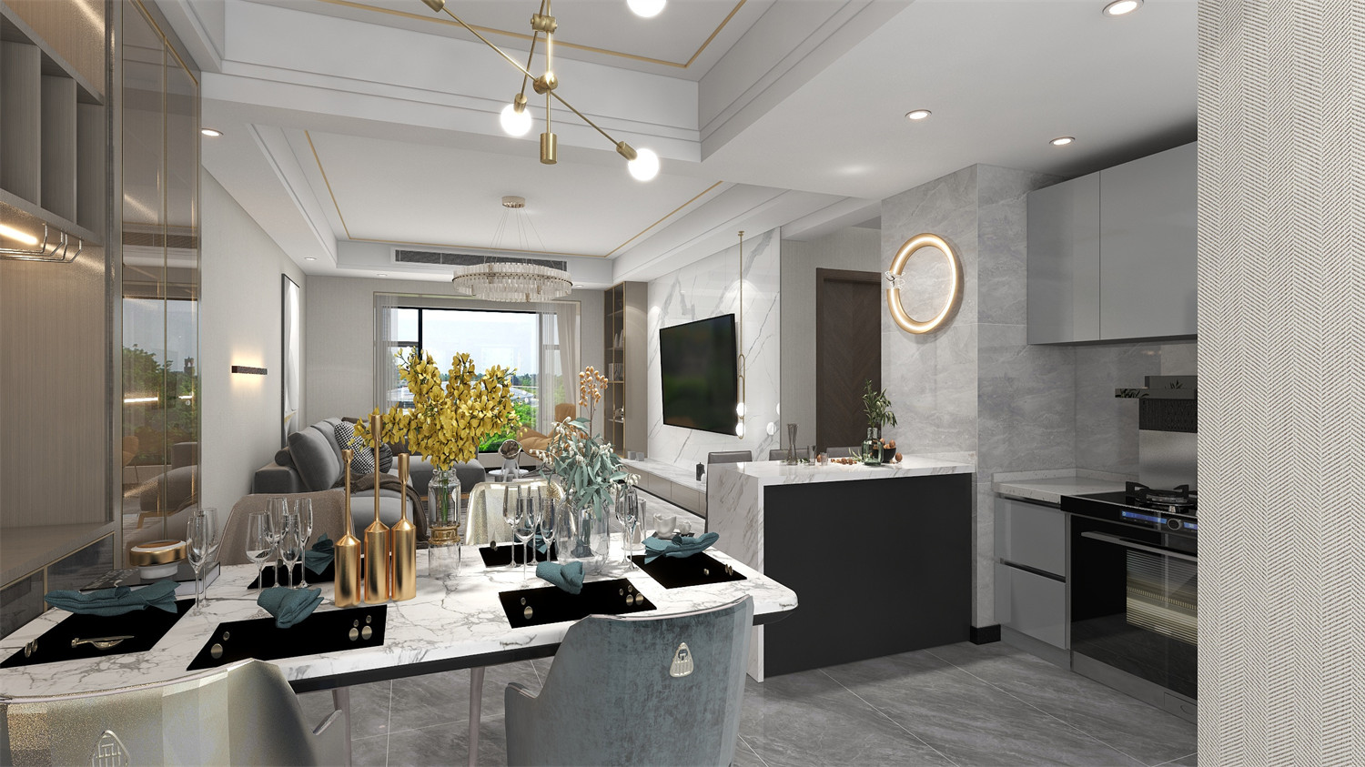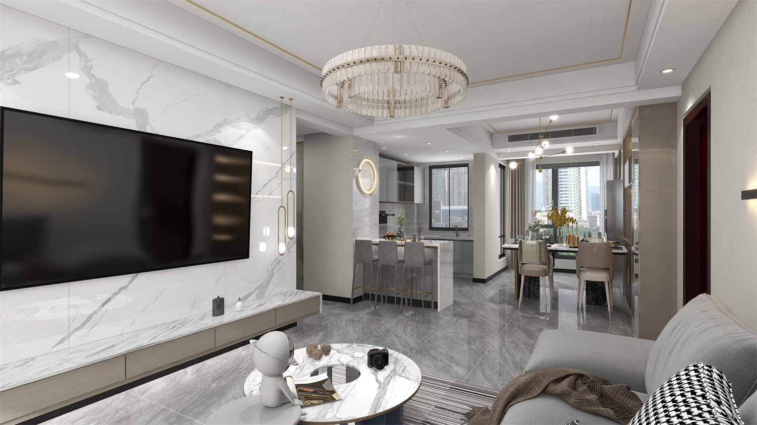 業主對空間的開闊性、實用性以及設計感非常關注,喜歡簡約不失時尚感的家居風格。對此,設計師以現代風為基礎,選用灰、白兩色為主調,運用大理石、墻紙、木材、金屬等元素進行合理搭配,最終呈現出這個精致實用的現代生活棲居。