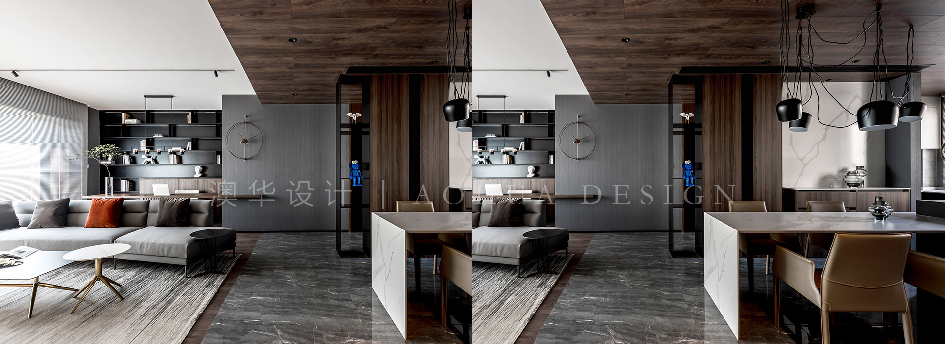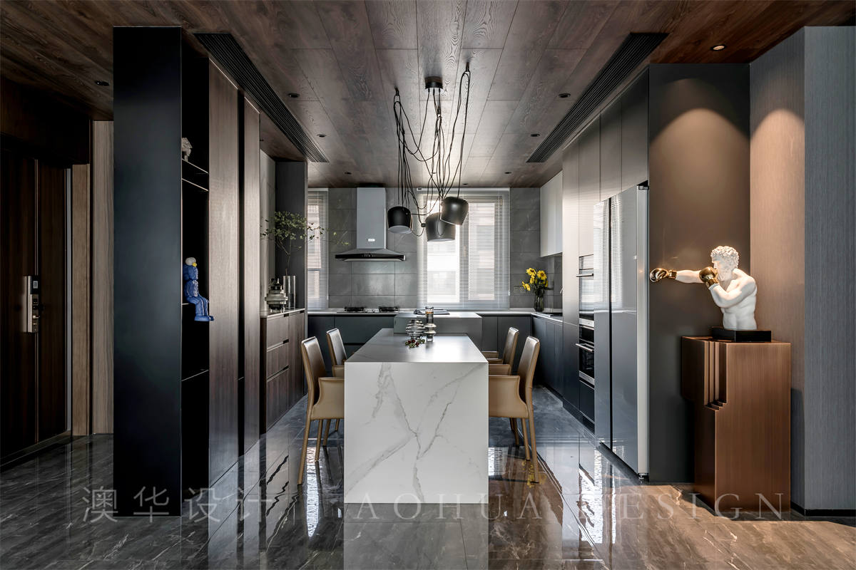 • 以克制純粹的設計語言演繹非凡品味與格調。餐廚一體化的設計,塑造出這一空間的流暢度與通透感。讓喜愛創造美食的女主人在沉迷料理的同時,亦能和家人朋友們分享這一刻的快樂。加長定制的餐桌島臺,除餐食功能外,亦是一家人喝茶聊天的休閑區域,“家”的溫度盡情濃縮于此。