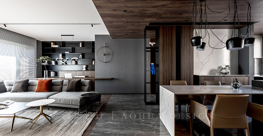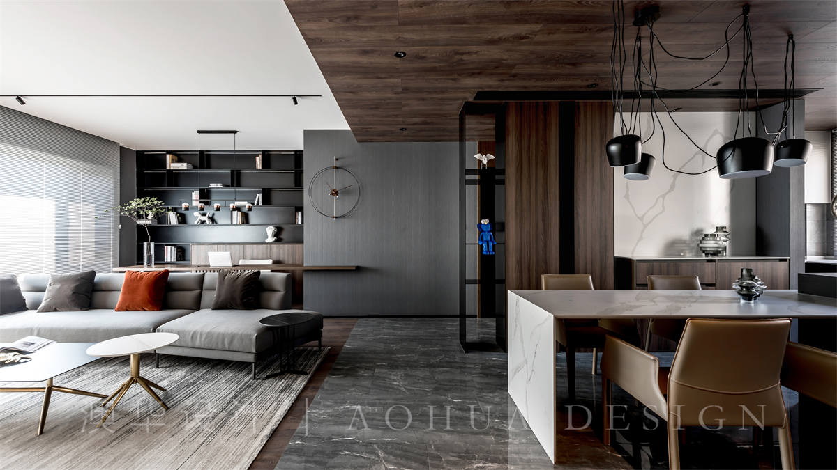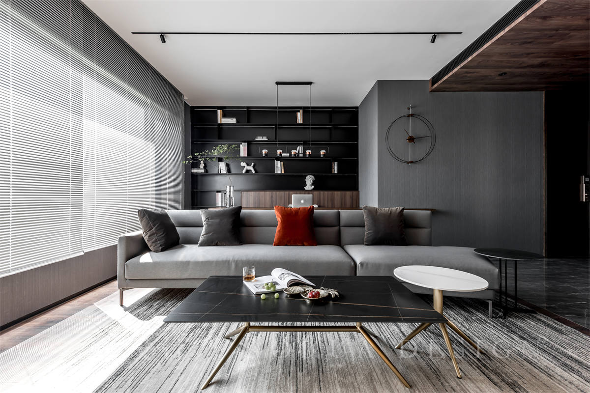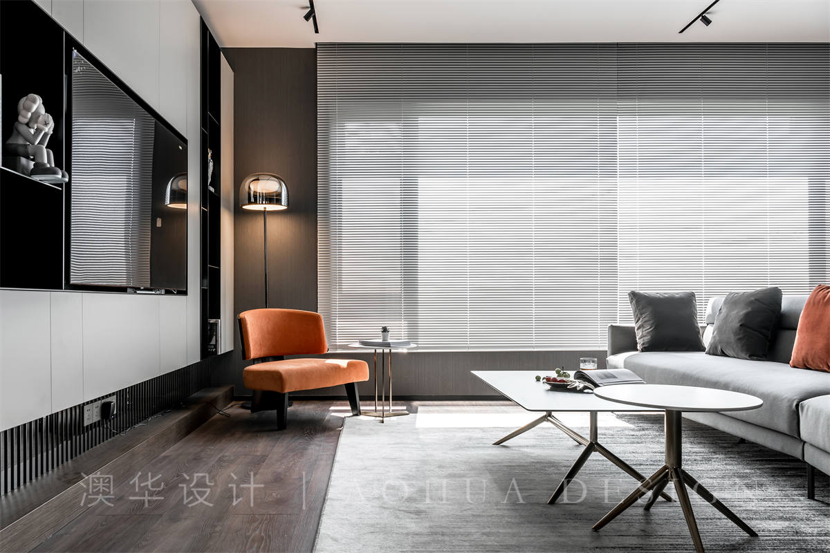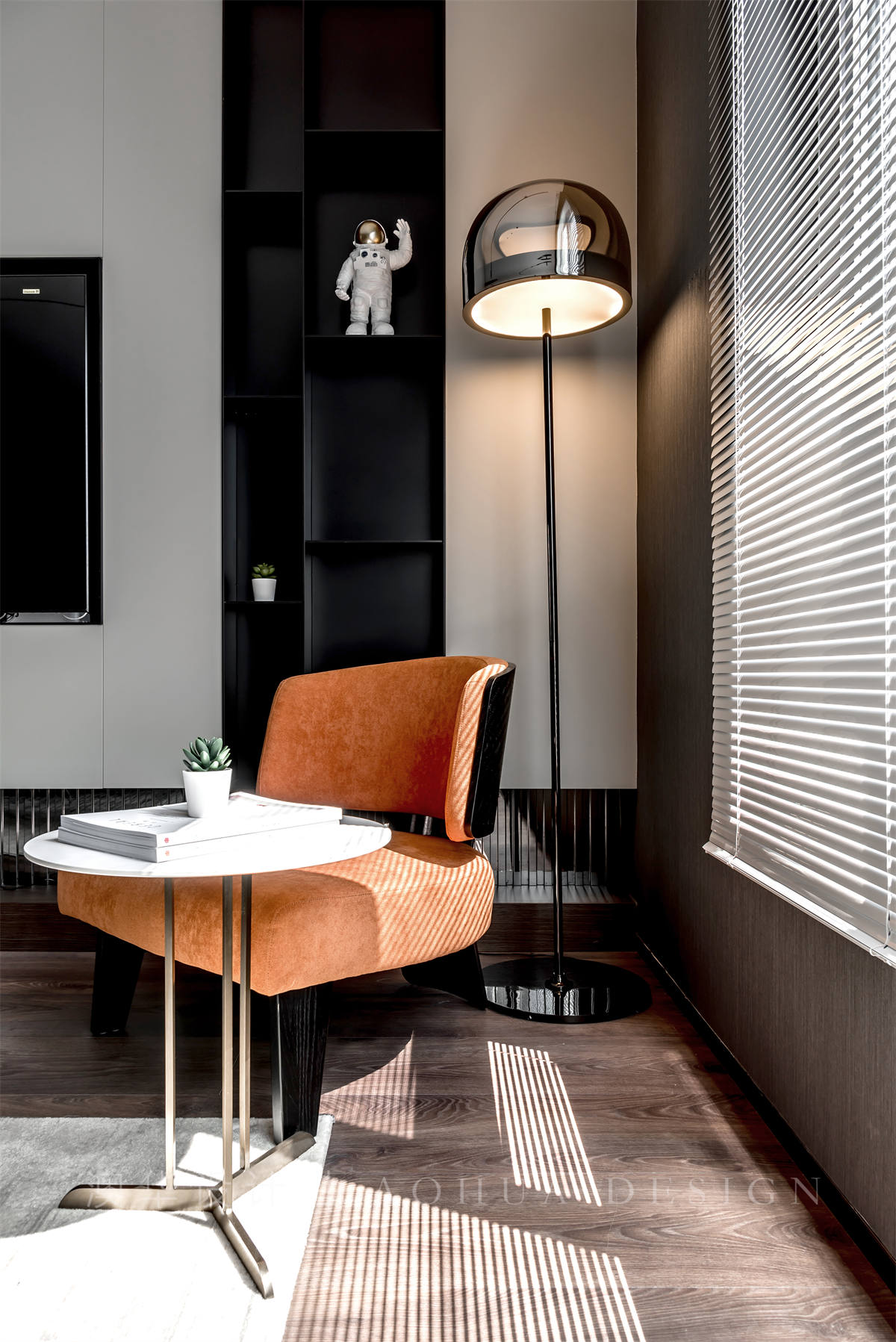 • 純粹的情緒,應該找到一處可以靜默的地方。黑、白、灰、橙四種不同色調,冷暖錯落,層次分明,讓空間色彩更加立體豐富。木色延續著整個空間的素雅,以溫和包容的方式,帶來最大化的明快與利落??|縷陽光透過電動百葉簾灑入室內,沉浸在一片柔和靜謐之中,內心在這一刻方得以安放,午后的陽光也變得慵懶而美好。原有不規則的小空間,被打造成開放式書房兼茶室功能,提升了空間的交流感,日常家人之間的溝通也變得更加流暢。簡潔有序的空間分割線,在不同的材質間交織鏈接,利用塊面屬性質感的差異,強調了線與面所形成的空間關系。
