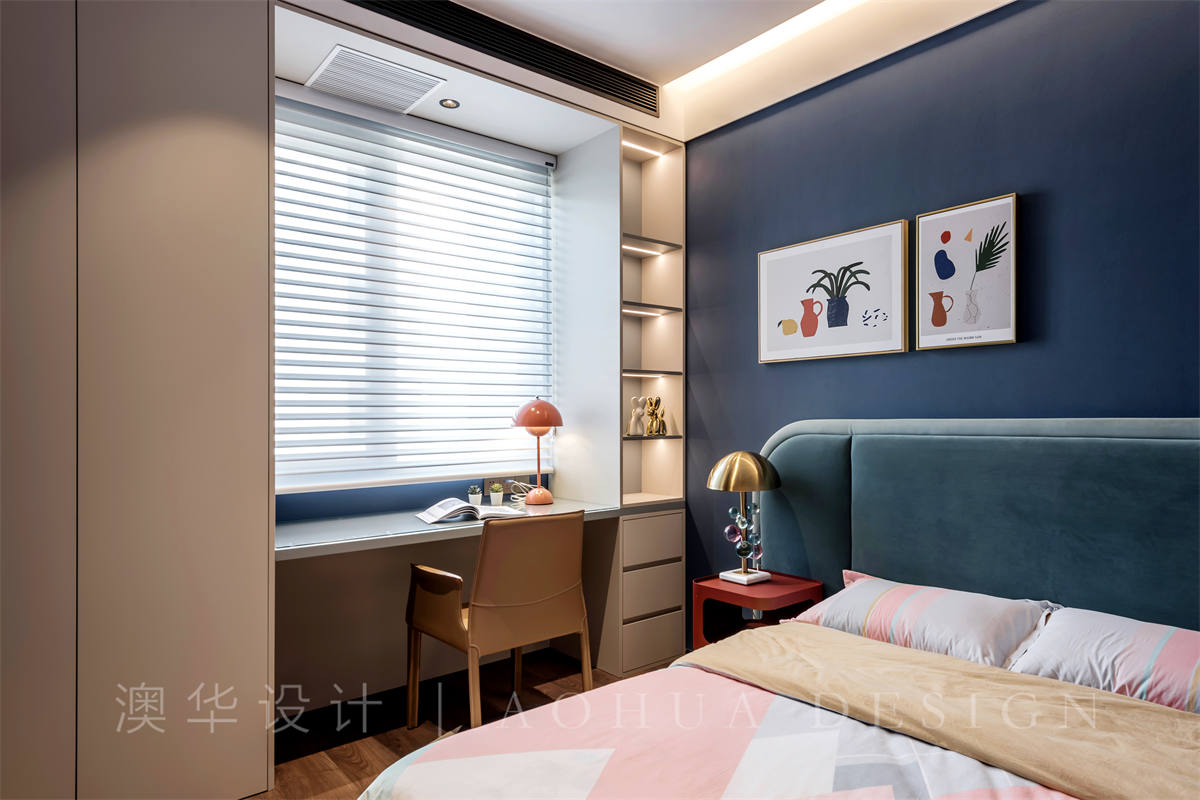 • 讓靈感自由釋放,創造一個心靈渴望的空間。臥室的空間十分緊湊,設計之中盡最大可能地挖掘了可利用空間。將儲物、字臺、書架等功能通過精巧設計一一實現。家庭中兩位小主人性格各異喜好不同,設計師為她們各自的空間,分別營造出了不同的色彩氛圍。主臥室作為一個家的基調,灰色和黃色交織出的是細膩雅致。床頭皮革和氛圍燈的結合,同時增加了休憩空間的品質感。