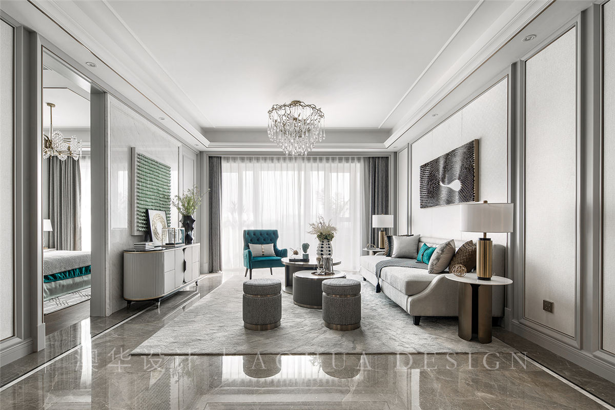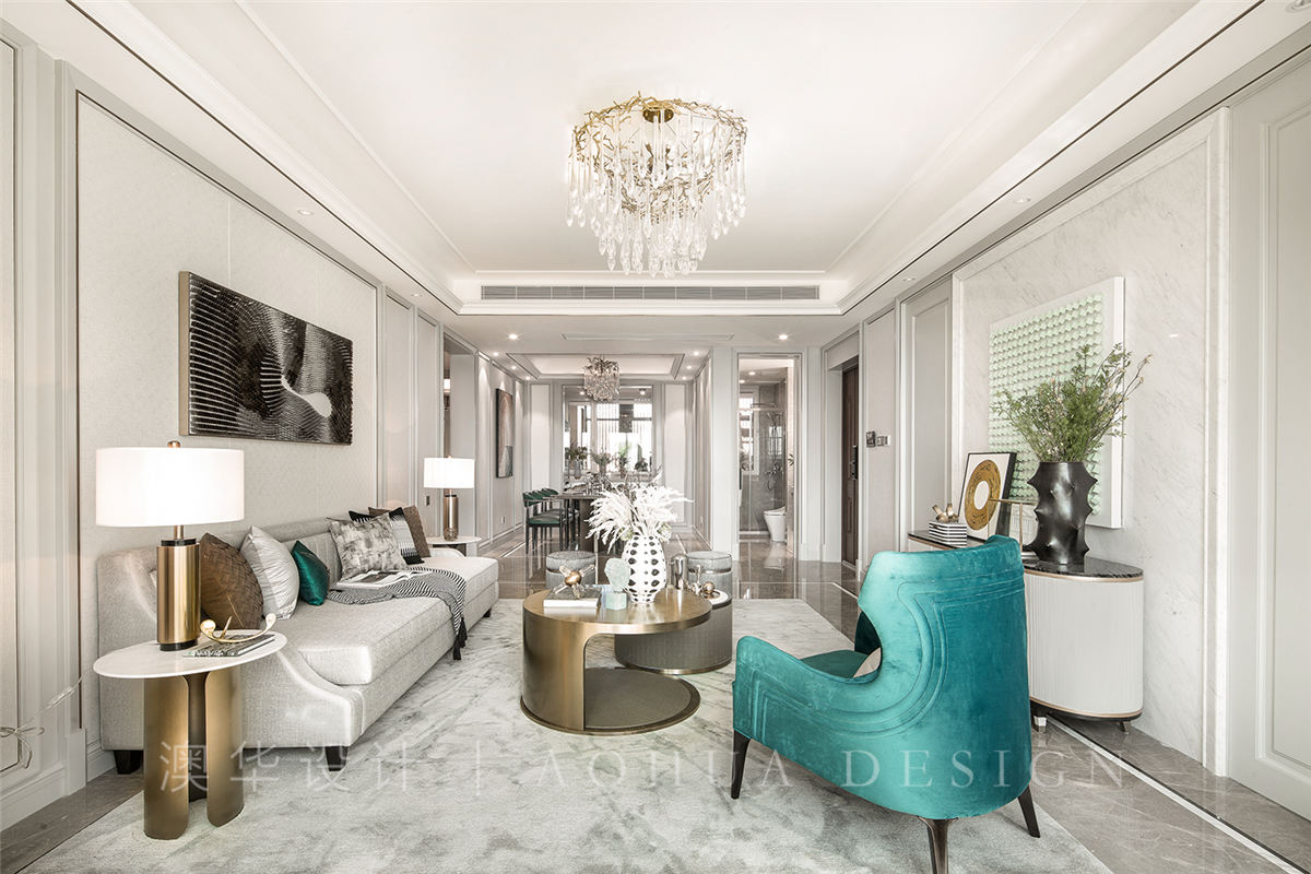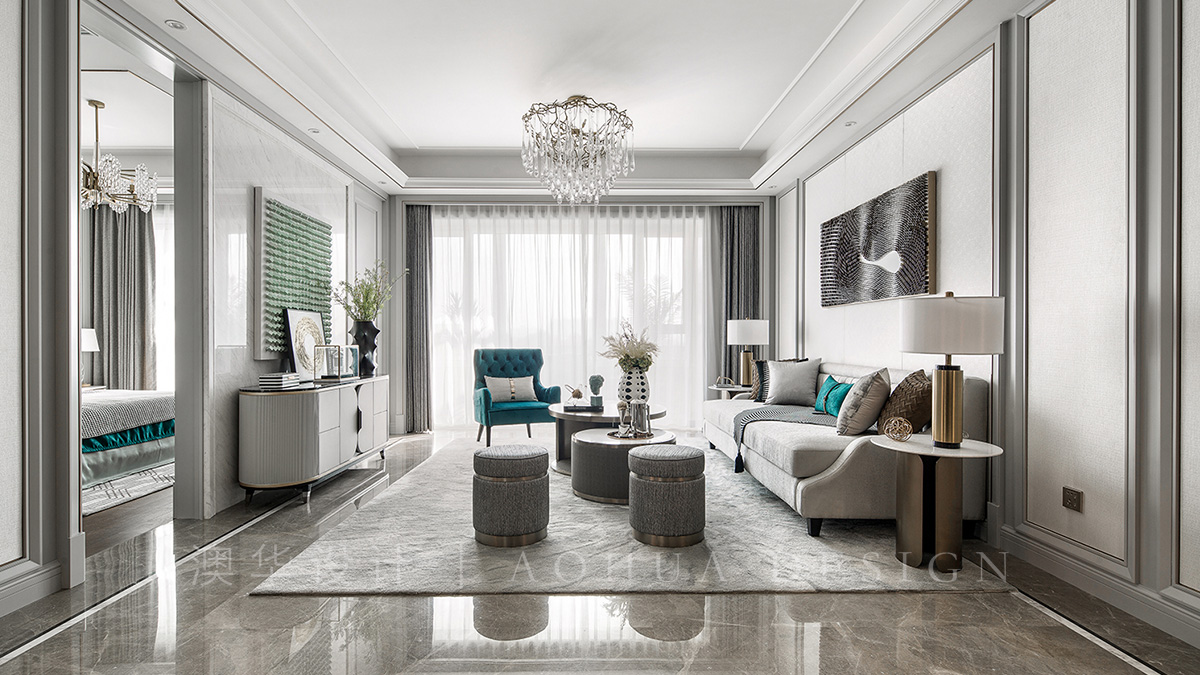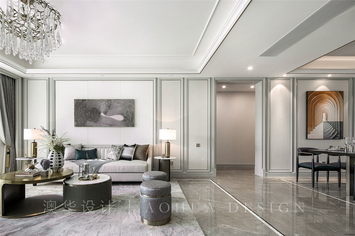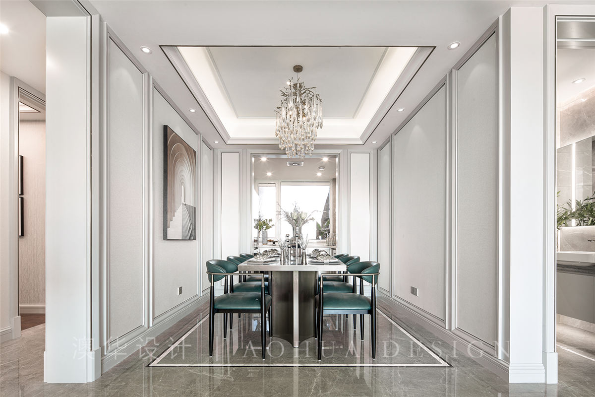 • 從玄關處到客廳形成完整的動線,仿佛走進法式的旋律之中,以淺色為空間基調詮釋雅致,運用木料,石材、金屬等元素,在重復、漸變的美學法則下,構成充滿張力的對話。墻面設計細節之處十分考究,通過線性部件來實現設計中的節奏,融入運動概念在空間中進行排序,同時利用室內光線的強弱變化創造韻律。