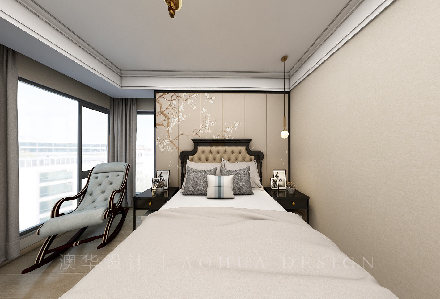 • 大大的落地窗與一把躺椅完美的與主臥室相融合,體現了臥室的豪華舒適感。