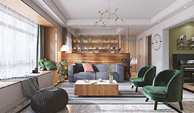 懸空電視背景墻配以木格柵裝飾,讓墻面更具層次感和藝術感,底部的電子壁爐無縫嵌入地臺內部,暖黃的火焰跳躍舞動,點亮生活的溫度,也將返璞歸真的自然之感帶入空間中,給人無限遐想和愜意感受。
