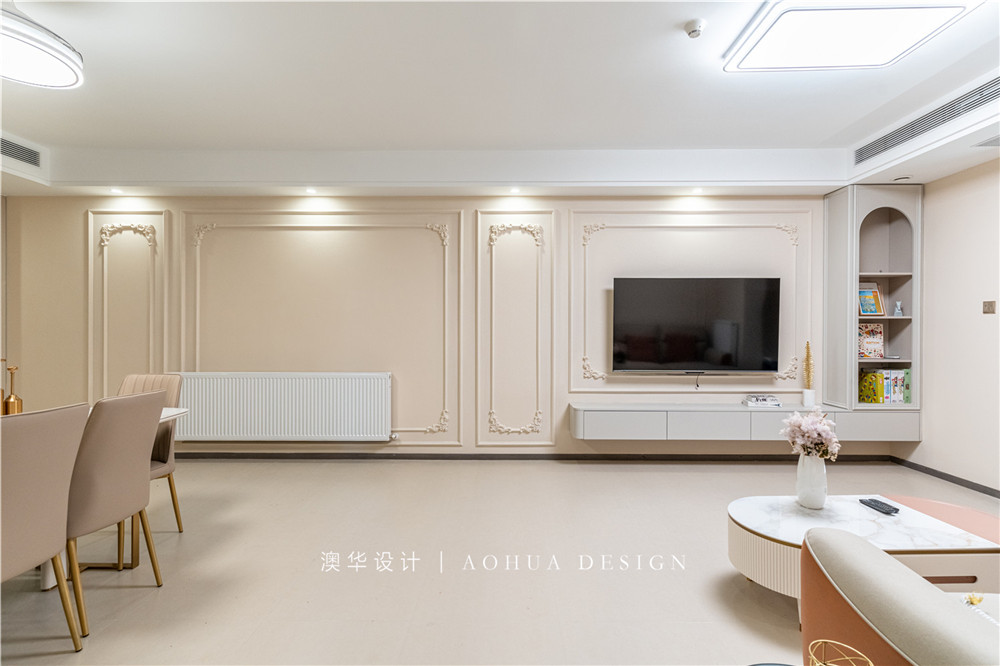 于硬裝設(shè)計中捕捉法式浪漫的氣韻,沙發(fā)背景墻以細(xì)膩的石膏線、雕花裝飾,鋪就優(yōu)雅簡練的空間底色;再通過圓弧門洞自然銜接餐廳墻面,延展視覺的同時更給空間帶去一絲曼妙,讓人瞬間墜入溫柔懷抱。