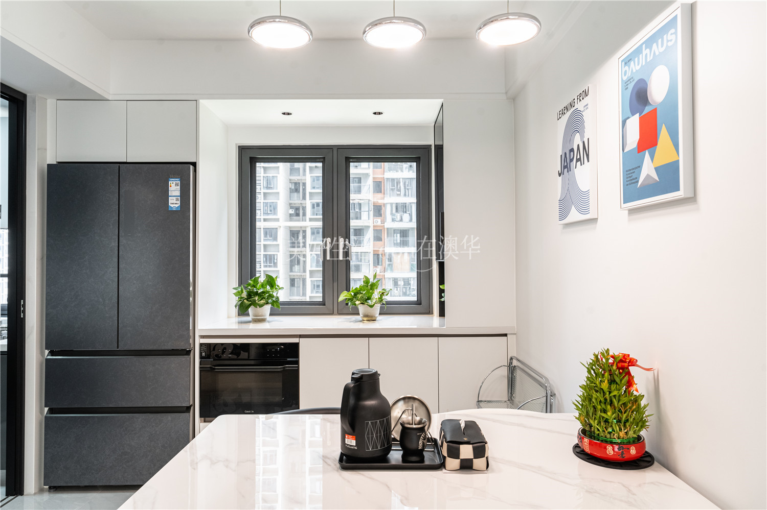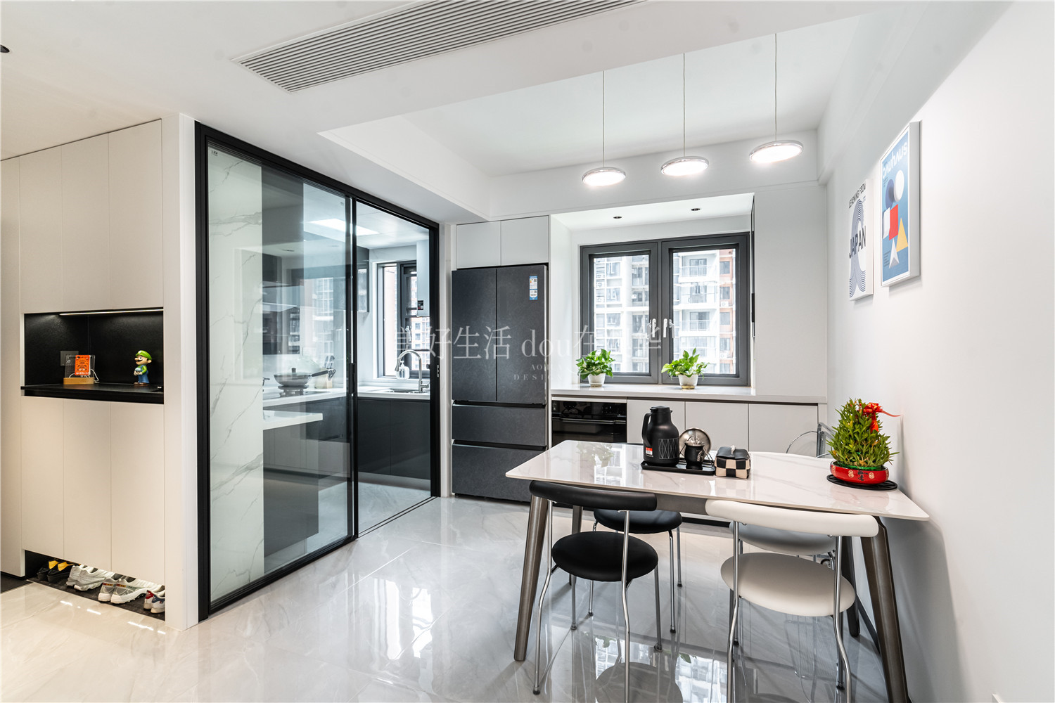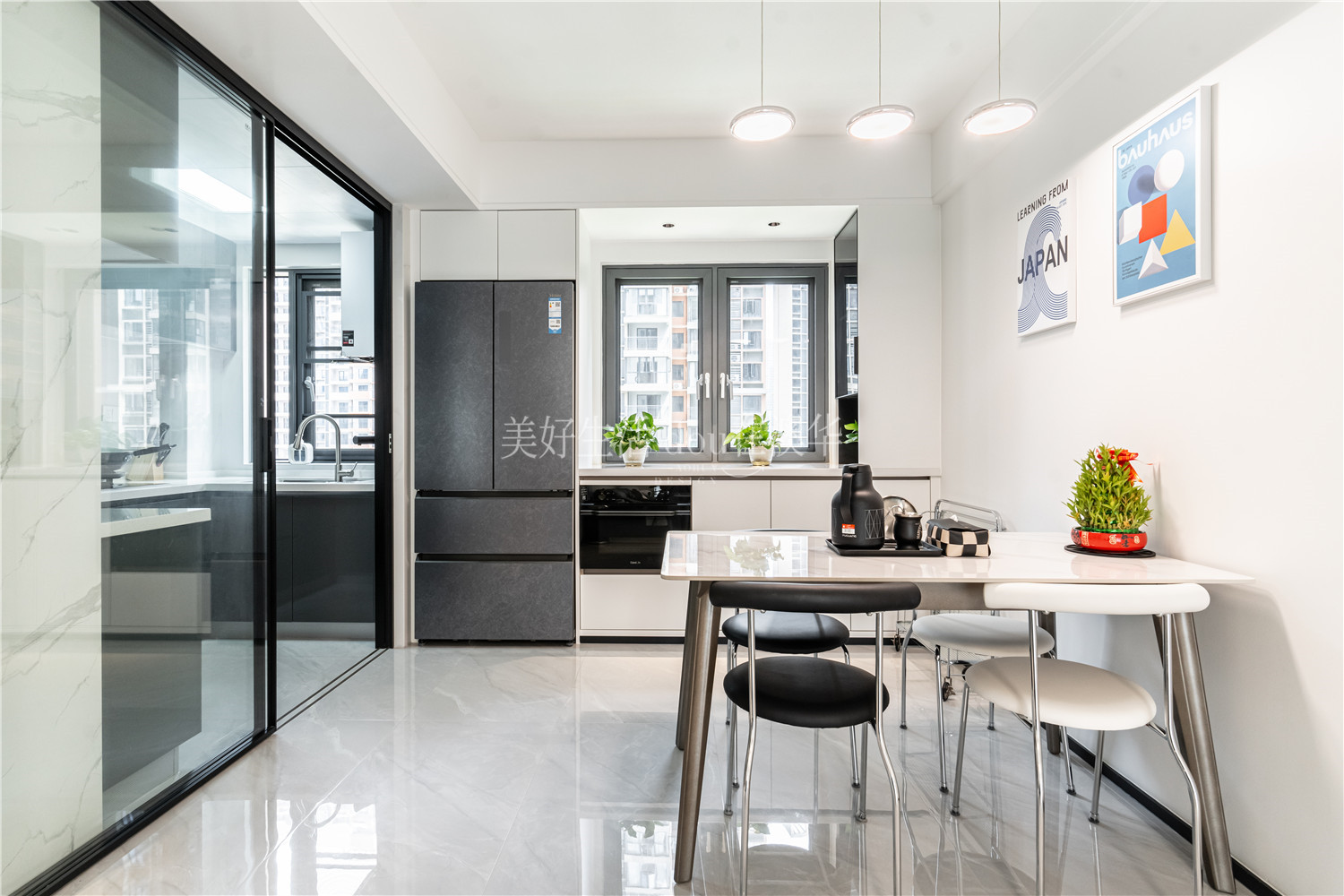 • 一黑一白的餐椅,生機盎然的綠植,墻上的幾何線條壁畫……設計師在藝術與自然的和諧共融中,將簡約之美滲透至每一個細微角落,讓日常生活充滿了閑情雅趣。