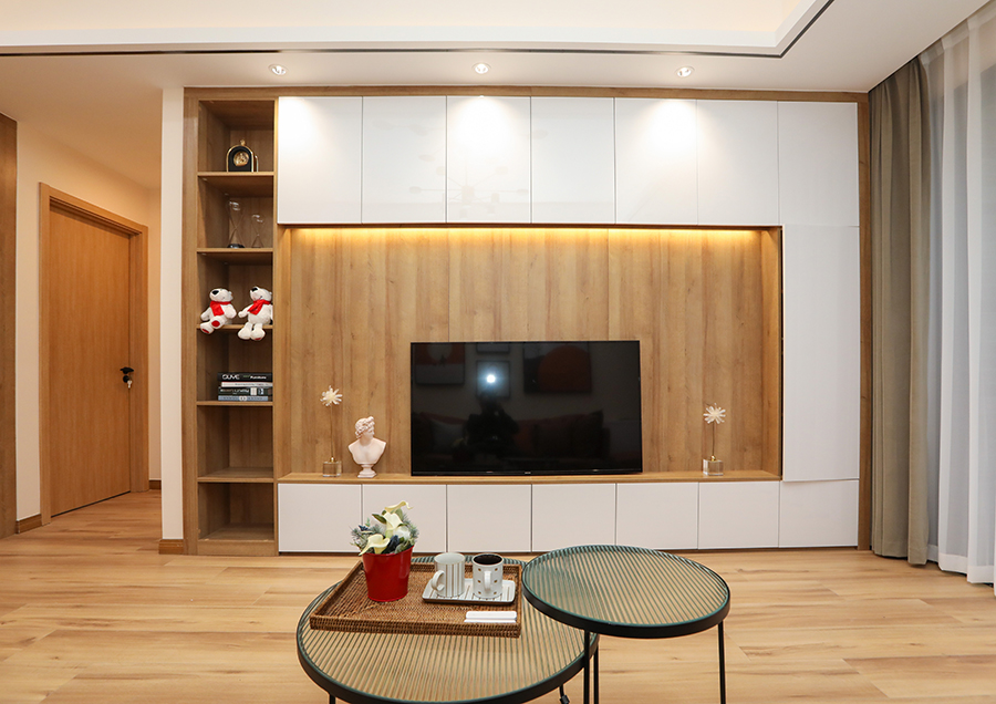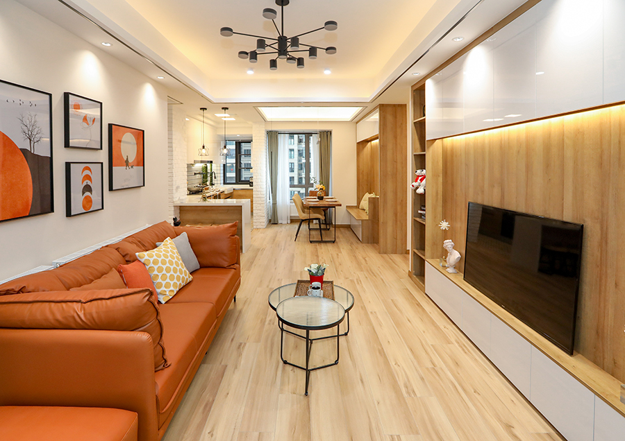 為了節(jié)省空間占用,客廳區(qū)域的電視背景墻巧妙的使用了一個(gè)原木混白色的儲(chǔ)物柜作為裝飾,簡(jiǎn)約而又不失實(shí)用性。