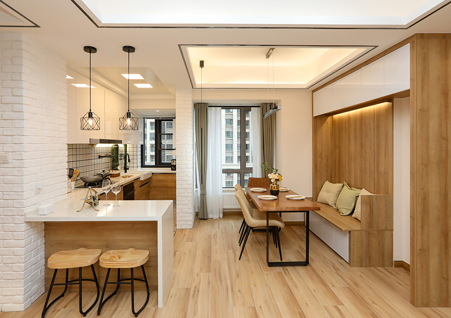餐廳區(qū)域與半開放的廚房被攝制組愛同一個(gè)區(qū)域中,如此即可有效節(jié)約使用面積,又能夠確保上菜與就餐的時(shí)間得到縮減。