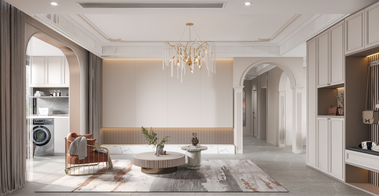復地東湖國際這套170㎡的四居室住宅戶型相對比較平整方正,而由于入戶門在房屋偏角處,因此設計師在進行規劃設計時就利用入戶門軸向作一個劃分,將作伴區域作為業主的辦公、休憩區域、中間則設置為會客區域,右邊則打造為兒童房,有效提升了各個功能區域的劃分。