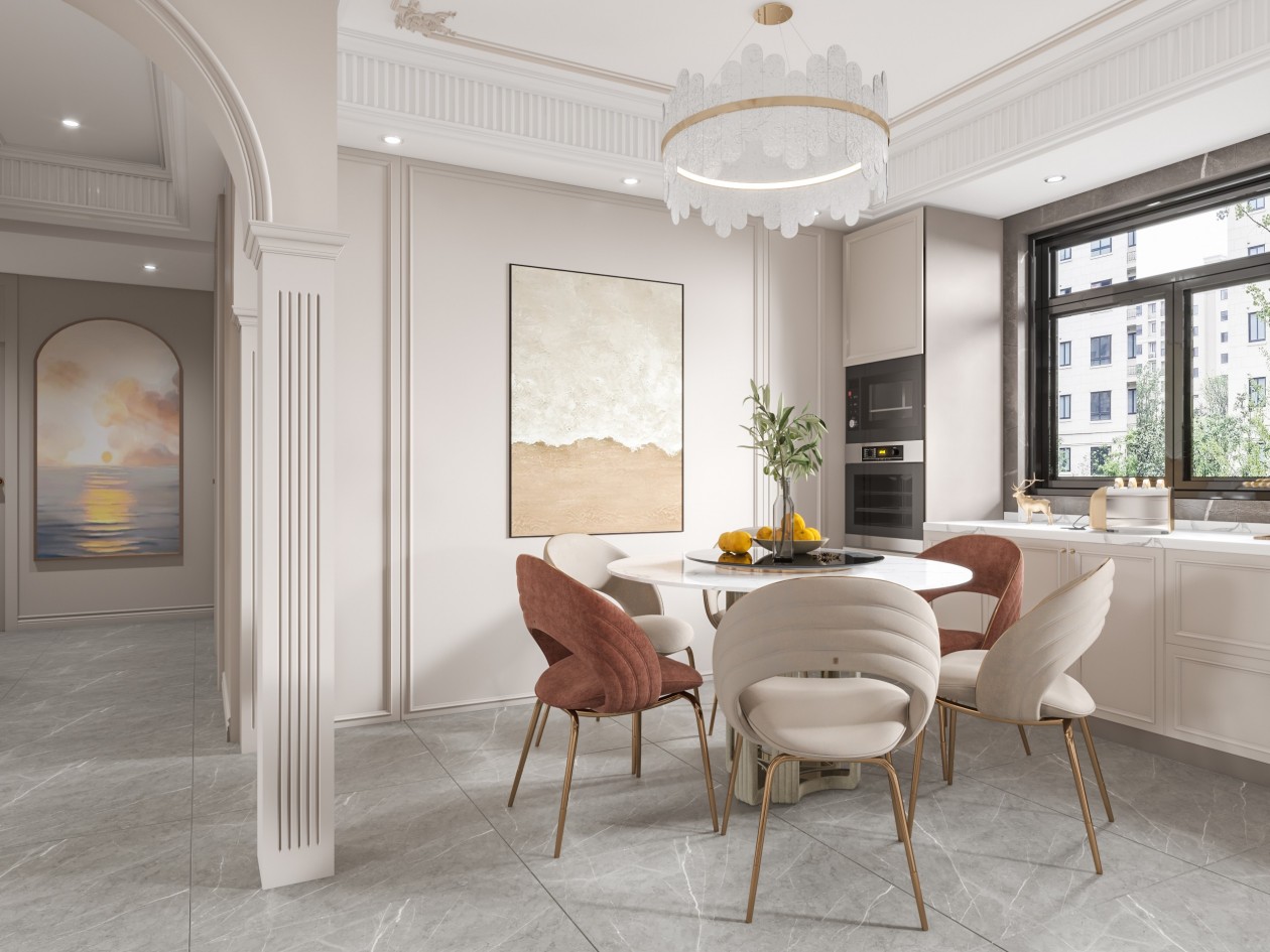 淡藍色的墻面為就餐區域增添了一抹清新明麗的氛圍,而造型優雅的餐座椅則讓整個就餐區域多了一抹精致的浪漫感。