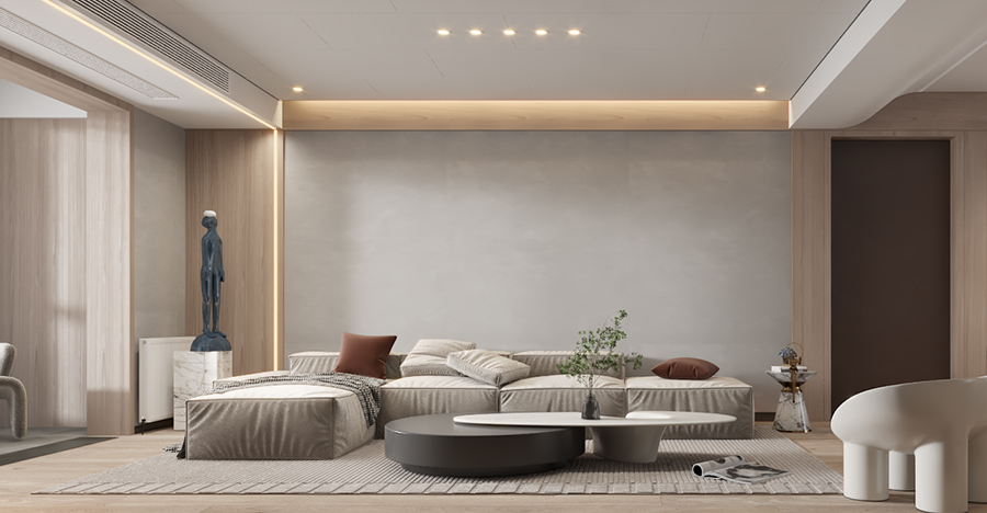 正方形的玄關寬敞大方,吊燈吊燈的橢圓形設計和地面瓷磚圖案相輔相成,樸素的灰色確保了居住的生活寧靜。