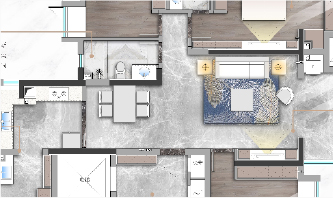 這套位于華僑城的300平方米五居室戶型整體方正歸整,客餐一體,橫廳大,公共活動空間寬敞,主次臥帶有衛生間,生活舒適度高,戶型缺點在于,右下角空間呈手槍型,餐廳到廚房的距離有些狹長,拐角處容易出現采光死角,在這個部分增置了一些軟裝設計,緩解了空間帶來的壓抑之感。