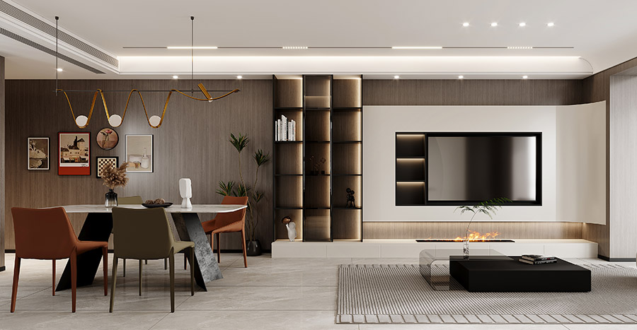 深褐色與灰色之間的碰撞,律動感十足的沙發混搭上線形背景墻,彰顯空間包容高雅格調。