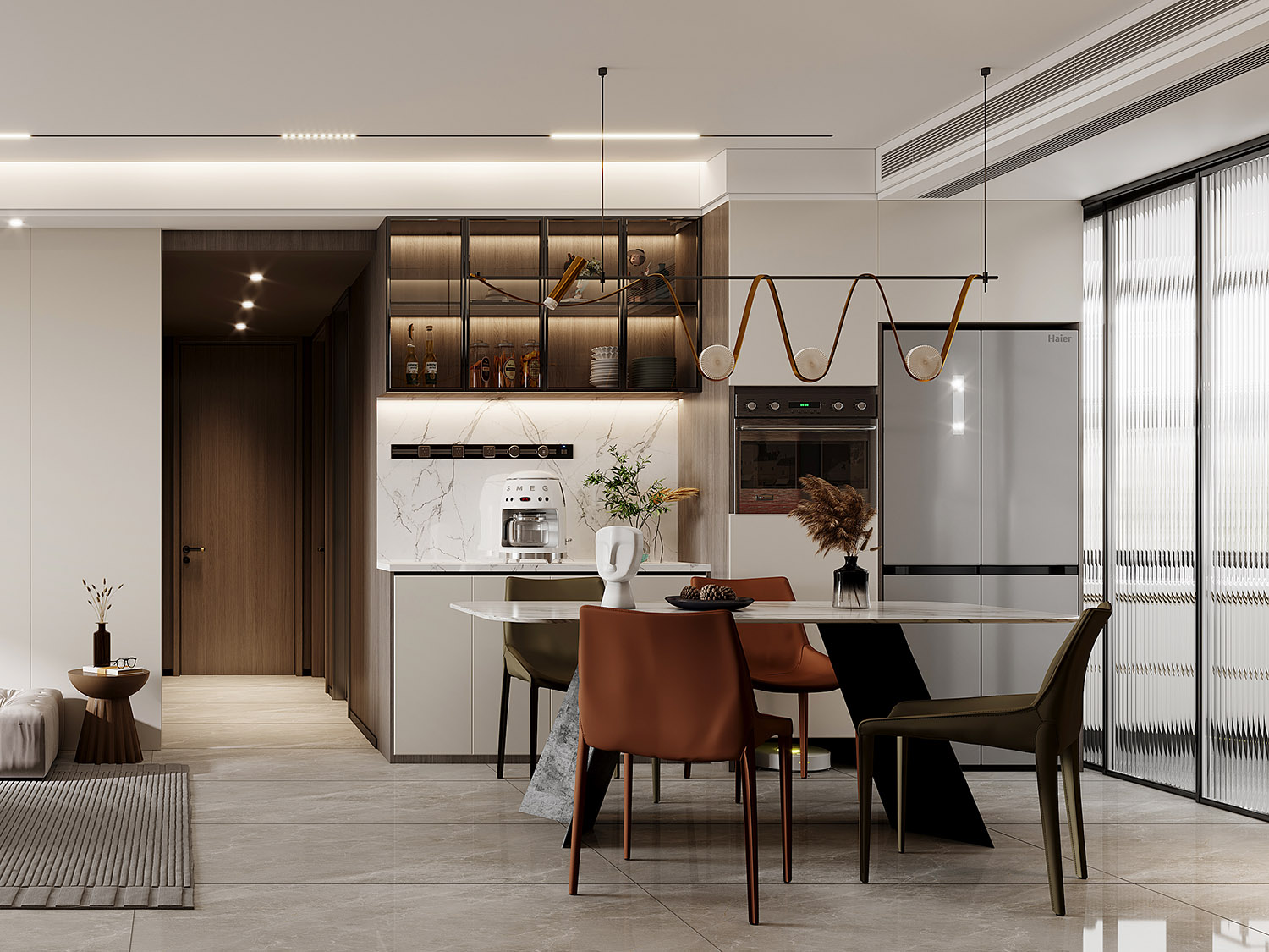 1 餐廳在提升視覺空間的同時,考慮充足存儲空間,并且打造了島臺,功能豐富多彩。